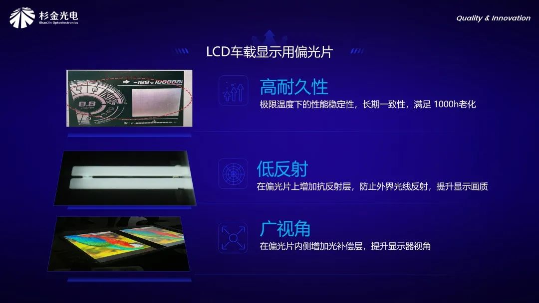 为提升驾驶安全性,车载显示屏的清晰度规格日益严格,以确保驾驶员可从更广的视角观看屏幕,而非仅从正面观看。这就需要车载显示用偏光片满足高对比度和广视角的要求。针对车载偏光片更高的性能要求,杉金光电开发了两大类产品。