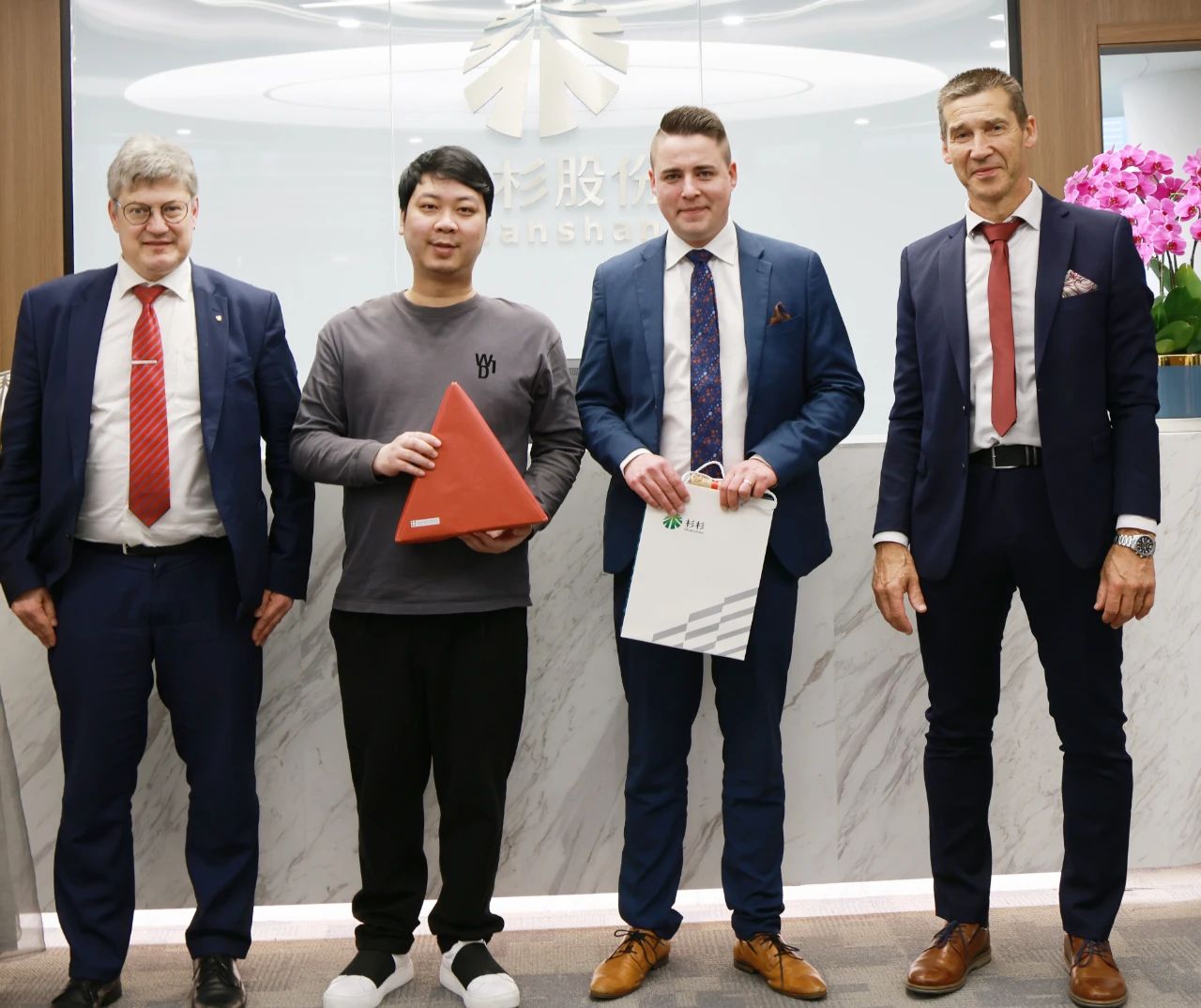 4月19日,芬兰科斯霍尔姆市议会主席Christoffer Ingo、市长Rurik Ahlberg、技术总监Ben Antell及芬兰投资署成员一行莅临杉杉,杉杉股份董事长郑驹、杉杉股份董事、副总裁,杉杉科技董事长李凤凤、杉杉科技执行总经理丁晓阳,及芬兰项目组成员接待并组织会议交流。